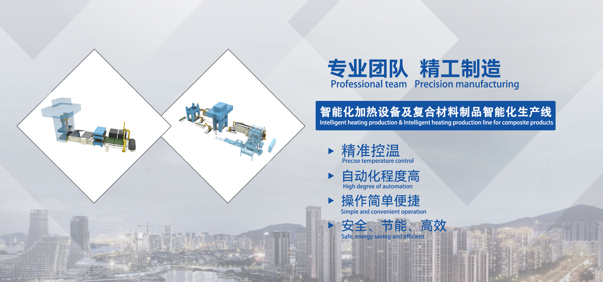 The following fields are covered: Far Infrared Oven, Heated Air Circulation Oven,Industrial oven,Curing furnace,Multilayer oven, Touch type heater,Multi-layer touch type heater,PET composite products intelligent production line,LWRT (lightweight reinforced thermoplastics) intelligent production line, GMT (glass mat reinforced thermoplastics) intelligent production line,LFT (long fiber reinforced thermoplastics) intelligent production line, Intelligent heating production line for Automobile carpet, Intelligent heating production line for Automobile ceiling, Intelligent heating production line for automobile wheel cover, Intelligent heating production line for Automotive interior parts,New energy vehicle battery cover and lower shell intelligent production line, SMC composite products intelligent production line,HP-RTM /HP-CRTM composite products intelligent production line,Intelligent heating production line for composite products, Ultrasonic plastic welding machine, Hot plate welding machine,Teflon strip composite machine, Steel strip composite machine, Felt sheet composite machine, Heating equipment supporting automation equipment, Such as truss loading manipulator and frame loading manipulator, Automatic up and down feeding machine, Spreading Machine, Automatic loading and unloading by robot, Gripper, Acupuncture group, Lorry, Air motor return device, Elevation structure etc.